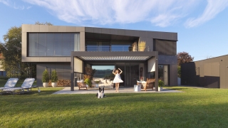 Bioklimatska pergola z ostrešjem iz nagibnih lamel